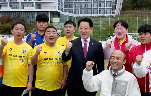 김영록 전남도지사는 6일 제43회 전국장애인체육대회 축구 경기가 열리는 목포국제축구센터를 찾아 전남 축구 선수단 경기를 관람하고 최정남 감독과 선수들을 격려했다.