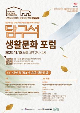 (재)담양군문화재단은 10일 오후 2시 죽녹원 월파관에서‘담양풍(風) 우리의 생활문화’라는 주제로 제2회 담구석(담양구석구석) 생활문화 포럼을 개최한다고 밝혔다.