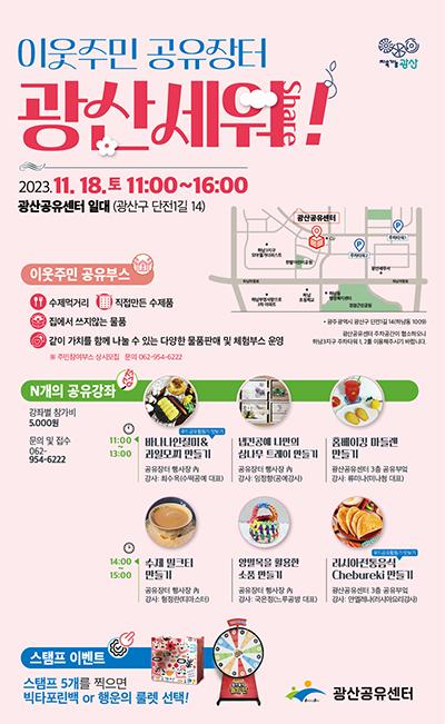 한편, 광산공유센터는 지난 8월8일 문을 열었다. 지속가능한 공유도시 광산 조성을 위해 물품·공간·재능을 공유하는 거점 공간이다. 118종 270여 개 물품을 대여할 수 있고 공유체험실, 공유부엌, 공유창작실 등 공간을 빌려 이용할 수 있다. 재능 공유 프로그램인 ‘N개의 공유강좌’도 운영하고 있다.