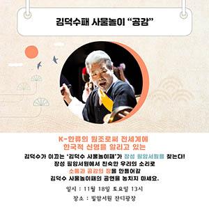 대미를 장식할 ‘김덕수패 사물놀이’는 전 세계를 무대로 전통음악을 알린 ‘케이(K)-한류’의 원조다. 신명나는 국악을 매개로 관객과 소통하며 공감을 이끌어낸다.