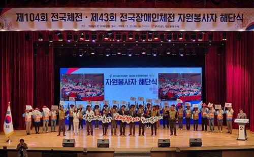 전남도는 제104회 전국체육대회 및 제43회 전국장애인체육대회 최일선 현장에서 성공 개최를 위해 헌신했던 자원봉사자 해단식을 23일 도청 김대중강당에서 성황리에 개최했다.