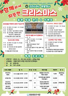 크리스마스 시즌을 맞아 도서관을 찾는 시민들에게 체험 프로그램과 다양한 이벤트를 통해 즐거움을 선사하고 2023년 탄생한 시민작가들의 출간작품과 원화를 전시해 풍성한 볼거리를 제공할 계획이다.