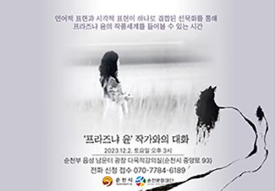 (재)순천문화재단(이사장 노관규)이 수탁 운영하는 창작예술촌 1호(곽재구 창작의 집)가 12월 2일 오후 3시 순천부 읍성 남문터 광장 다목적강의실에서 ‘프라즈냐 윤’ 작가와의 대화를 진행한다.