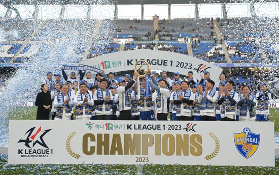 3일 오후 울산시 문수축구경기장에서 프로축구 하나원큐 K리그1 2연승을 달성한 울산 현대선수들이 우승 세리머니를 하고 있다. 2023.12.03