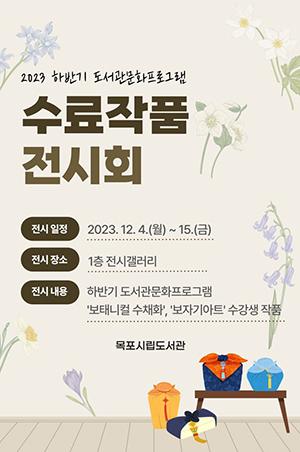 목포시립도서관이 2023년 하반기 도서관문화프로그램 운영을 마치고 4일부터 15일까지 도서관 1층 전시갤러리에서 수강생 수료작품 전시회를 연다.