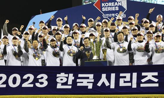 13일 서울 송파구 잠실야구장에서 열린 \'2023 신한은행 쏠 KBO 한국시리즈(KS)\' 5차전 kt 위즈와 LG 트윈스의 경기. 6대2로 LG 트윈스의 승리. 통합스코어 4대1로 한국시리즈 우승을 차지한 LG 트윈스 염경협 감독을 비롯한 선수들이 시상식에서 구광모 LG 회장, 허구연 KBO 총재 등과 함께 트로피를 들고 우승 세리머니를 하고 있다. 2023.11.13.