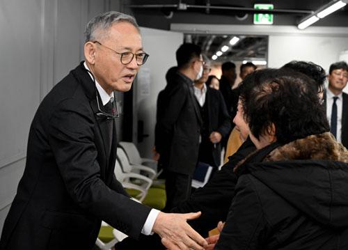 유인촌 문화체육관광부 장관이 8일 오전 광주 동구 전일빌딩245 회의실에서 \'5·18민주화운동 최후항쟁지\' 옛 전남도청 복원지킴이 어머니들과 만나 인사하고 있다.