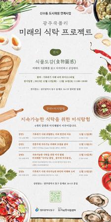 광주 동구는 오는 12~16일까지 산수동에 위치한 광주쿡폴리(콩집·청미장)에서 지속 가능한 미래의 식문화에 대한 담론의 장 ‘미래의 식탁 프로젝트’를 진행한다고 밝혔다.
