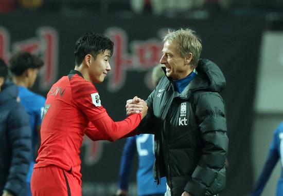 16일 서울월드컵경기장에서 열린 2026 피파 북중미 월드컵 아시아 지역 2차 예선 대한민국 대 싱가포르 경기, 싱가포르를 5대0으로 꺾은 한국 클린스만 감독과 손흥민이 인사를 나누고 있다. 2023.11.16