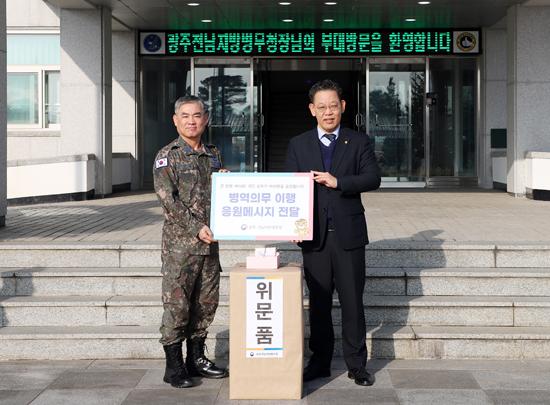 광주전남지방병무청은 26일 공군 제1전투비행단을 방문해 병역이행 응원 메시지와 위문품을 전달하고 장병들을 격려했다고 밝혔다.