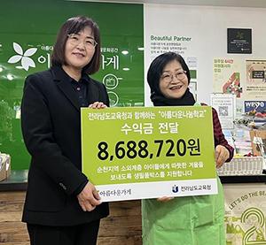 재단법인 아름다운가게 순천지역은 최근 순천교육지원청에 올해 진행한 나눔 프로젝트 ‘아름다운 나눔학교’ 의 수익금을 전달했다고 28일 밝혔다.