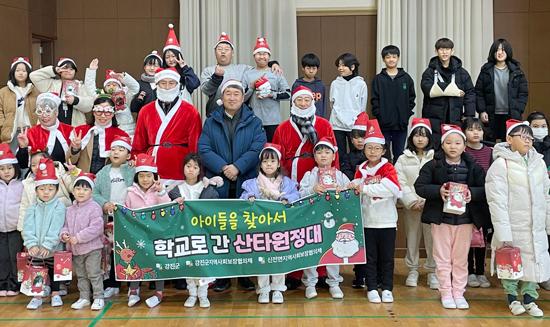신전면 산타 원정대는 신전초등학교 학생 31명과 신전 병설유치원 아동 10명에게 크리스마스 깜짝 선물로 인형과 간식, 음료 등을 전달했다.
