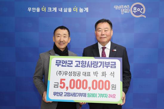 무안군은 박화석 ㈜우성정공 회장이 ‘무안군 고향사랑기부 릴레이’ 24호 주자로 참여하며 기부금 500만 원을 기탁했다고 밝혔다.