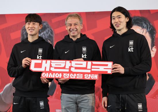 대한민국 축구 국가대표팀 이재성(왼쪽부터), 위르겐 클린스만 감독, 조규성이 28일 서울 용산구 CGV 아이파크몰에서 열린 2023 아시아축구연맹(AFC) 카타르 아시안컵 축구 국가대표팀 명단 발표식에서 포즈를 취하고 있다. 2023.12.28.