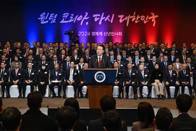 윤석열 대통령이 2일 서울 영등포구 중소기업중앙회에서 열린 2024년 경제계 신년인사회에서 격려사를 하고 있다.