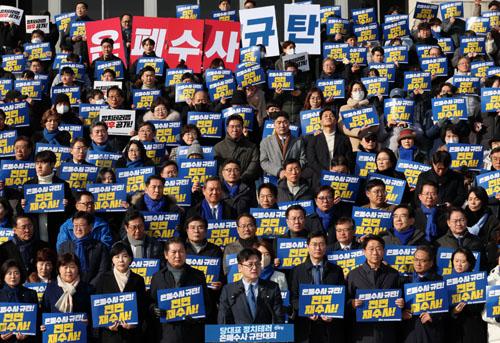 민주당 의원들은 이날 오후 국회 본청 앞 계단에서 \'당대표 정치테러 은폐수사 규탄대회\'를 열고 수사 당국이 전면 재수사에 착수해야 한다고 주장했다.
