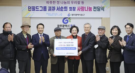 광주 동구는 지난 16일 패션기업인 던필드그룹의 서순희 회장이 관내 어르신과 장애인들을 위해 백미 332포대(10㎏)와 컵라면 200박스를 기탁했다고 밝혔다.