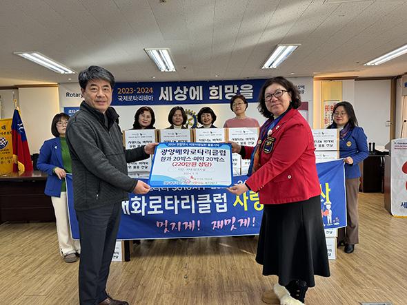박정옥 광양매화로타리클럽 회장은 “노인요양시설에 계신 어르신들이 따뜻한 겨울을 나고 건강도 챙기실 수 있도록 설탕을 쓰지 않고 만든 한과와 최고급 미역을 후원하게 됐다”면서 “앞으로도 기부를 계속 이어 나갈 것”이라고 밝혔다.