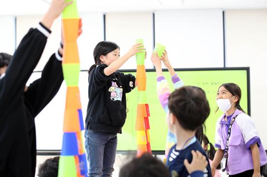 광주 북구 양산도서관 겨울방학 독서교실에 참가한 초등학생들이 컵 쌓기를 하고 있다. /광주 북구 제공