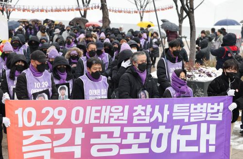10.29 이태원 참사 유가족들이 지난 17일 오후 서울 중구 서울광장에 마련된 10.29 이태원 참사 합동분향소에서 10.29 이태원 참사 유가족 침묵의 영정 행진을 하고 있다.