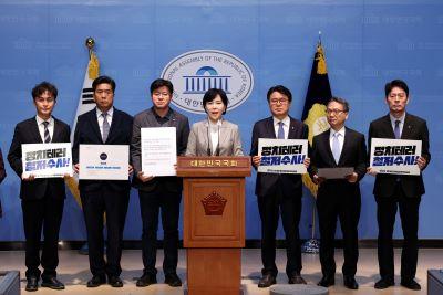 이들은 \"지난 시기 국회에서 윤 대통령 면전에서 \'줄일 것은 예산이 아니고 윤의 임기\'라는 피켓을 들었던 것에 대한 졸렬한 보복 폭력\"이라며 \"국정 기조를 바꾸지 않으면 국민들이 불행해진다\"고 주장했다.