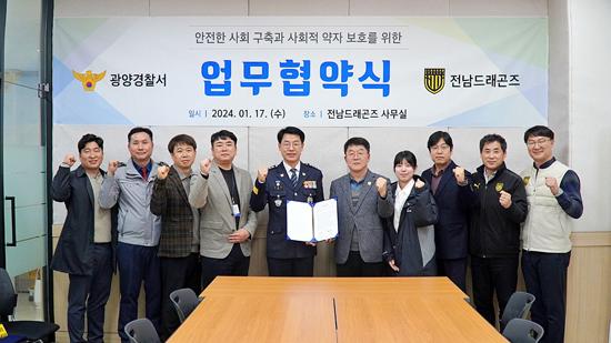 전남드래곤즈와 광양경찰서가 지역의 소외된 아동과 청소년들의 잠재적 범죄 예방과 사회적 약자를 보호하기 위한 업무협약을 체결했다고 21일 밝혔다.