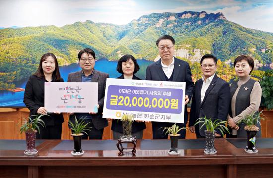 화순군은 이웃에게 희망과 사랑을 전하는 나눔문화 분위기 확산을 위해 2023년 12월 1일부터 2024년 1월 31일까지 2개월간 ‘희망 2024 나눔 캠페인’을 전개하는 가운데 NH농협 화순군지부에서 어려운 이웃을 위해 현금 2000만 원을 기부했다고 밝혔다.