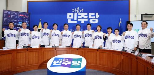 이재명 더불어민주당 대표를 비롯한 지도부가 24일 오전 서울 여의도 국회에서 더불어민주당 새 PI를 공개한 후 기념촬영을 하고 있다.