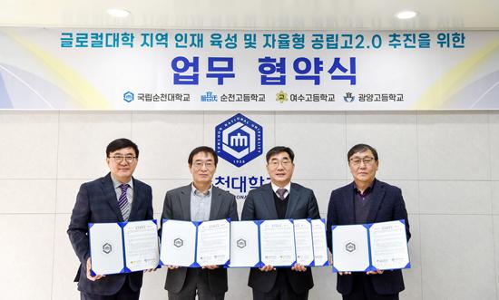 국립순천대학교는 대학 본부에서 순천고등학교, 여수고등학교, 광양고등학교와 자율형공립고2.0 추진 및 지역인재 양성을 위한 업무협약을 체결했다고 29일 밝혔다.