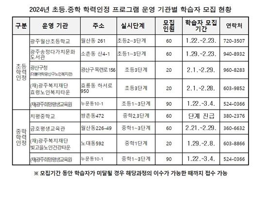 광주시교육청은 2024년도 초등·중학 학력인정 문해교육 프로그램 학습자를 모집한다고 30일 밝혔다.