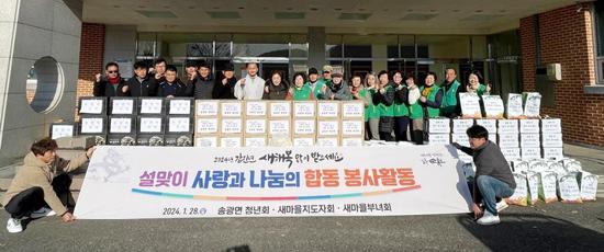 이번 행사는 매년 청년회에서 추진하는 ‘설맞이 경로당 떡국 나눔행사’에 뜻을 같이하고자 합동 봉사활동을 하게 됐으며, 각 단체들은 송광면 관내 27개 경로당을 방문해 어르신들에게 물품을 전달했다.