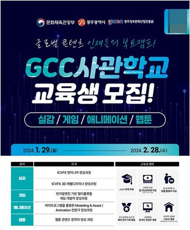 광주시는 문화콘텐츠산업을 이끌어갈 글로벌 콘텐츠 인재를 양성하기 위해 \'광주실감콘텐츠큐브\'(GCC) 사관학교 1기생을 오는 28일까지 모집한다고 1일 밝혔다.
