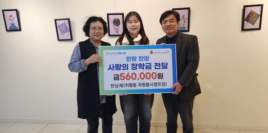 광주시 서구 치평동 자원봉사캠프장으로 활동하고 있는 한남례씨가 지난 2일 장학금 56만원을 전달했다.