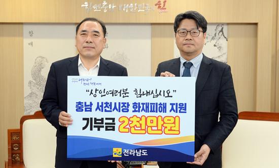 전남도는 2일 충남 서천군 수산물특화시장 화재로 피해를 입은 상인들을 위해 성금 2000만 원을 충남도에 전달했다.