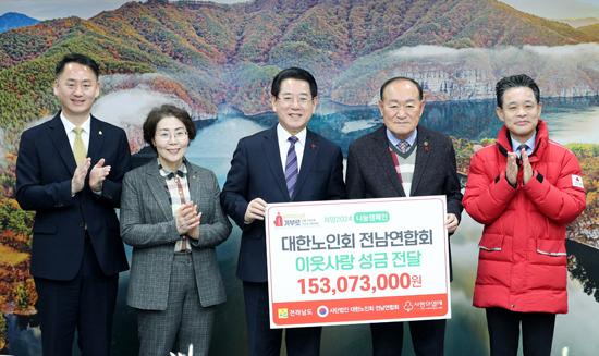 전남도는 6일 사단법인 대한노인회 전남연합회에서 도내 취약 어르신을 위해 기탁한 이웃사랑 성금 1억5300만 원을 사회복지공동모금회 전남지회에 전달했다고 밝혔다.