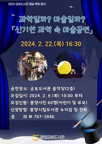 광양금호도서관이 겨울방학을 맞아 어린이들에게 과학의 신비와 예술(마술) 체험 활동이 함께하는 「신기한 과학 속 마술 공연」을 오는 22일 운영한다.
