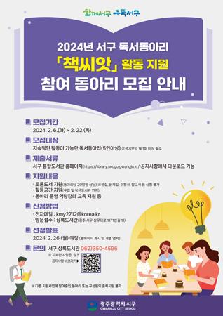 광주시 서구는 오는 22일까지 독서 생활의 기반이 되는 서구 독서동아리‘책씨앗’에 참여할 50개 팀을 모집한다.