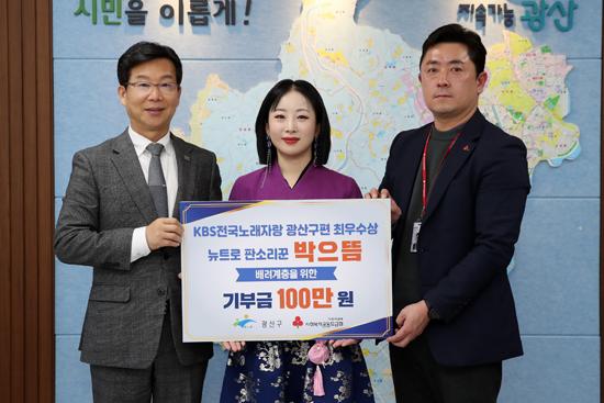 KBS 전국노래자랑 광산구편에서 최우수상을 받은 ‘로컬 크리에이터(지역 가치 창출가)’ 국악인 박으뜸 씨가 13일 광산구 돌봄 이웃을 위해 100만 원을 후원했다.