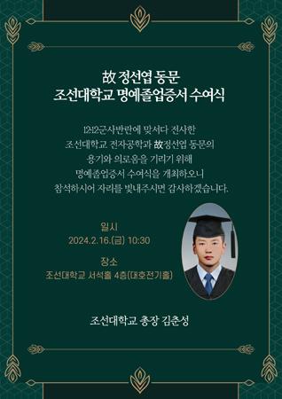 명예졸업장 수여식은 전자공학과 77학번 정선엽 동문의 의로움을 기리기 위한 것이라고 조선대는 설명했다.