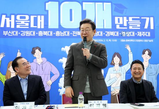 이재명 더불어민주당 대표가 15일 오후 충북 청주시 충북대학교 오창캠퍼스에서 열린 \'서울대 10개 만들기\' 정책간담회에서 모두발언을 하고 있다. 2024.02.15.