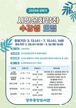 광주중앙도서관과 분관 최상준도서관이 지역 주민들을 대상으로 ‘2024년도 상반기 시민문화강좌 수강생’을 모집한다.