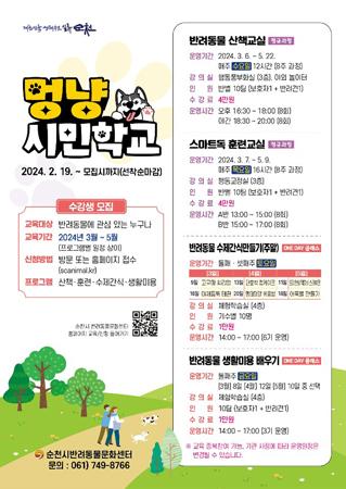 순천시는 반려동물문화센터(역전길 50, 조곡동)에서 반려동물의 사회화·예절 교육부터 산책교육, 행동 교정을 받을 수 있는 ‘멍냥시민학교’를 오는 3월부터 운영한다고 밝혔다.