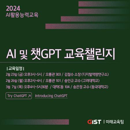 ‘AI 및 챗GPT 교육 챌린지’는 ▲GIST 교직원 대상 23일 오후 3시-5시, 디지털역량연구소 김철수 소장(오룡관 303호) ▲직원 및 일반인 대상 26일 오후 2시-4시, 고려대학교 송인규 교수(오룡관 101호) ▲학생 및 연구원 대상 3월 7일 오후 4시-5시 30분, 동국대학교 송은정 교수(대학C동 104호) 강연이 총 3회 진행될 예정이다.