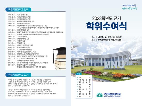 국립목포대학교는 22일 오전 70주년기념관 청강아카데미아홀에서 전진우 총동문회장, 김원이 국회의원, 김화진 국민의힘전남도당위원장, 전경선 전남도의회부의장, 문차복 목포시의회의장 등 내빈을 비롯한 교무위원, 졸업생 및 가족 등이 참석한 가운데 2023학년도 전기 학위수여식을 개최한다고 밝혔다.