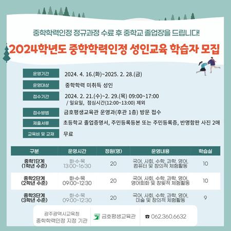 금호평생교육관이 21일부터 29일까지 ‘2024학년도 중학학력인정 성인교육’ 1~3단계 학습자를 모집한다.