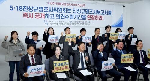 민주사회를위한변호사모임은 21일 오전 광주 서구 광주시의회 시민소통실에서 기자회견을 열고 \"5·18진상조사위의 조사결과보고서 초안을 공개해야 한다\"며 이같이 주장했다.