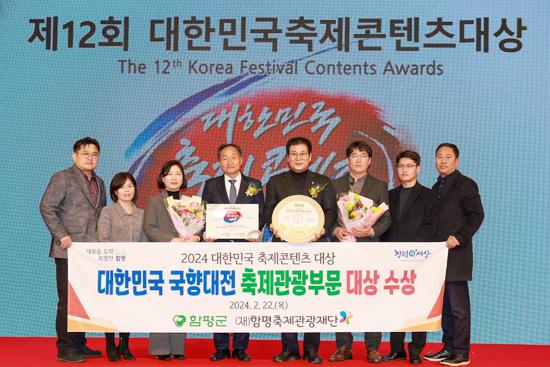 함평군은 함평군에서 주최하는 ‘대한민국 국향대전’이 22일 서울 백범김구기념관 컨벤션홀에서 개최한 제12회 대한민국축제콘텐츠대상 시상식에서 축제관광부문 대상을 수상했다고 밝혔다.