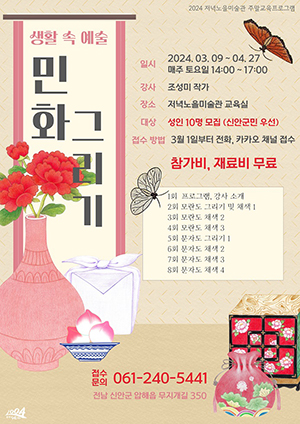 ‘생활 속 예술-민화 그리기’ 주말 교육프로그램은 오는 3월 9일부터 4월 27일까지 매주 토요일 총 8회차 진행한다. 성인 10명을 모집하며 참가비는 무료다. 수업방식은 1대 1 지도를 통해 전통 채색화의 기초를 배우고 모란, 문자도를 그릴 예정이다. 수업을 이끌 조성미 작가는 목포 민화연구회로 활동하며 목포대 평생교육원과 신안군 1004 책방에서 출강 중이다.