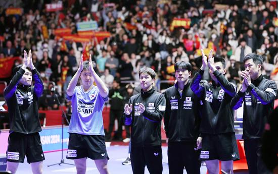24일 부산 해운대구 벡스코에서 열린 BNK부산은행 2024 부산세계탁구선수권대회 남자 준결승 한국과 중국의 경기에서 한국 남자 탁구대표팀아 매치 스코어 2-3으로 패, 선수들이 관중들에게 인사하고 있다. 2024.02.24.