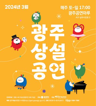 2024 광주상설공연은 12월 22일까지 매주 토~일요일 오후 5시 광주공연마루(서구 상무시민로 3)에서 열리며, 모든 좌석(사전예매)은 무료다. 자세한 일정과 예매 관련 사항은 티켓링크, 광주예술의전당 홈페이지 또는 전화(062-613-8379)로 확인할 수 있다.